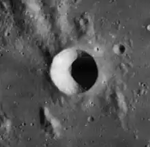 Chladni is a small lunar impact crater that lies near the northwest edge of Sinus Medii, in the central part of the Moon. The crater is named for German physicist and musician Ernst Chladni who,[1] in 1794, wrote the first book on meteorites.[2] The rim of the crater is roughly circular, and there is a small central floor at the midpoint of the sloping inner walls. This feature has a higher albedo than the surrounding terrain. It is connected by a low ridge to the rim of the crater Murchison, which lies to the northwest. Due east of Chladni is the larger Triesnecker.