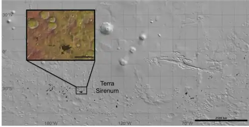 Terra Sirenum is a region in the southern highlands of Mars[5] (approximately at 38.8°S, 221°E), with a distinguishing feature of a higher brightness as compared to the typical background soils.[1] It is of particular interest because it is the location of the largest regional occurrence of chlorides.[6][7] One study has interpreted six regions of chloride deposits (10 – 50 km2) in the lowest topographical levels of an inter-crater basin (300 – 400 km) as individual salt flats. Connecting channels between the salt flats provides evidence for a common origin, such as evaporation of water.[6] Comparing these salt flats to ones observed on Earth, such as those in the Atacama Desert further supports the hypothesis of a formation due to evaporation.[8] Using CRISM data, this study also observed phyllosilicates in the rims of craters and the surrounding ejecta to occur near the chlorides.[6] Another study also observed phyllosilicates to be closely located to chlorides with CRISM, as well as THEMIS.[5] Phyllosilicates also provide evidence for aqueous processes occurring during the Noachian period.[9] Both studies determined that the phyllosilicates were deposited first.[5][8]