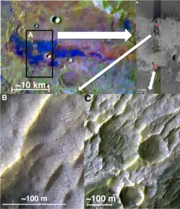 Across the southern highlands of Mars, approximately 640 sites of chloride-bearing deposits have been identified using the Thermal Emission Imaging System (THEMIS). These isolated, irregularly shaped patches (approximate size range of 0.33 – 1300 km2, with an average size of 24 km2) have been dated to the older geologic periods on Mars: Noachian (4.5 – 3.5 billion years ago) and Hesperian (3.5 – 2.9 billion years ago) periods.[1] On Earth, chlorides are known to form through aqueous processes.[2] Similar processes are expected to be responsible for the formation of chloride deposits on Mars. The finding of these deposits is significant in that it provides further evidence for the presence of surface or subsurface water in ancient Mars.[3]