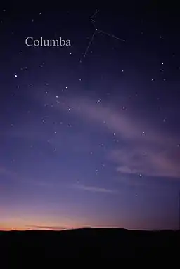 Columba is a faint constellation designated in the late sixteenth century, remaining in official use, with its rigid limits set in the 20th century. Its name is Latin for dove. It takes up 1.31% of the southern celestial hemisphere and is just south of Canis Major and Lepus.