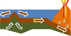 Mantle convection is the slow creeping motion of Earth's rocky mantle caused by convection currents carrying heat from the interior of the Earth to the surface.[32] It is one of 3 driving forces that causes tectonic plates to move around the Earth's surface.[33]