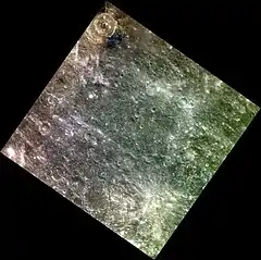 Regional approximate color view by MESSENGER, with Darío along lower right margin
