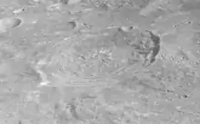 The rim of Delambre has a terraced interior, with a tiny craterlet lying along the northern rim. In the south is a low cut forming a slight notch. The crater interior has an irregular surface. It has high walls, with some peaks reaching 15,000 feet. Delambre was photographed by the uncrewed probe Ranger 8 on its descent towards Mare Tranquillitatis. Delambre is from the Upper Imbrian epoch, which lasted from 3.8 to 3.2 billion years ago.[2][3]