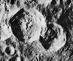 ![]() Lunar Orbiter 1 image of Shirakatsi crater (left) and Dobrovolʹskiy crater (right) | |