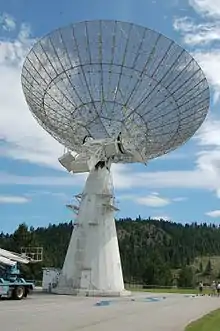 The John A. Galt Telescope consists of a single 25.6-metre-diameter (84 ft) metal-mesh antenna which can be equipped to observe at 408 MHz and at 1.5, 2.7, 4.9, 6.6, and 8.4 GHz, including the hydrogen line near 1.4 GHz, the OH lines around 1.6 GHz, and the methanol line near 6.6 GHz.[4] The telescope, formerly simply referred to as the 26-metre Telescope, was renamed in honour of John A. Galt, first employee and former director of the DRAO, during a special ceremony in 2014.[5] The Galt telescope was used in the first successful measurements using very long baseline interferometry.