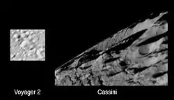 ![]() Voyager 2 and Cassini views of Duban Crater | |