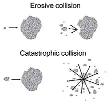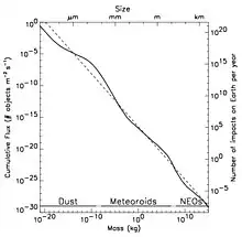 Dohnanyi[121] demonstrated that asteroids of <100 km diameter reached a collisional steady-state which means that in each mass interval the number of asteroids destroyed by collisions equals the number of same mass fragments generated by collisions from bigger asteroids. This is the case for a cumulative mass distribution F ~ m-0.837. At 1 AU meteoroids bigger than 1 mm in size are in a collisional steady state. The significant excess of smaller meteoroids is due to the input from comets. Models of the interplanetary dust environment of the Earth result in 80-90% of cometary dust vs. only 10-20% of asteroidal dust.[122][123] The shortage of dust particles <1 micron is due to the rapid dispersion by the Poynting-Robertson effect and by direct radiation pressure.
