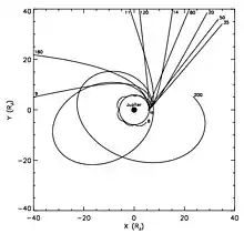 Very different conditions exist in planetary magnetospheres. An extreme case is the magnetosphere of Jupiter where the volcanically active moon Io is a strong source of plasma at 6 RJ, where RJ = 7.1×104 km is the radius of Jupiter. At this distance is the peak of the plasma density (3×109 m−3) and the plasma energy has a strong minimum at ~1 eV. Outside this distance the plasma energy rises sharply to 80 eV at 8 RJ. The resulting dust surface potentials range from -30 V in the cold plasma between 4 and 6 RJ and +3 V elsewhere.[162] Jupiter’s magnetic field is mostly a dipole, with the magnetic axis tilted by ~10° to Jupiter’s rotation axis. Out to about 10 RJ from Jupiter the magnetic field and the plasma co-rotates with the planet. At Io’s distance the co-rotating magnetic field passes by Io at a speed of 17 km/s and the magnetic field strength 2×10−6 T = 2000 nT. Positively charged dust particles from Io in the size (radius) range from 9 to ~120 nanometers are picked up by the strong magnetic field and accelerated out of the Jovian system at speeds up to 350 km/s. For smaller particles the Lorentz force dominates and they gyrate around the magnetic field lines just like ions and electrons do.[163]