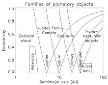 Two families of small Solar System bodies lie outside the scattering zones of the giant planets and are remnants of the primordial protoplanetary disc around the Sun: asteorids and the Kuiper belt objects. The Kuiper belt is approx. 100 times more massive than the asteroid belt and is part of the trans-Neptunian objects (TNOs).[146][147] The other part of TNOs is the scattered disk with objects having orbits in the scattering zone of Neptune. At high eccentricities (or high inclinations) the scattering zones of neighboring planets overlap. Therefore, scattered disk objects can evolve into Centaurs and, eventually, into Jupiter-family comets. Inside the Jupiter scattering disk is the Zodiacal cloud consisting of interplanetary dust that originates from comets and asteroids. Also dust particles from the Kuiper belt find the scattering passage to the inner planetary system.[148]