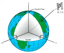 It is convenient to define the orientation of an ECI frame using the Earth's orbit plane and the orientation of the Earth's rotational axis in space.[3] The Earth's orbit plane is called the ecliptic, and it does not coincide with the Earth's equatorial plane. The angle between the Earth's equatorial plane and the ecliptic, ε, is called the obliquity of the ecliptic and ε ≈ 23.4°.