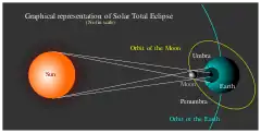 The periodicity of solar eclipses is the interval between any two solar eclipses in succession, which will be either 1, 5, or 6 synodic months.[2] It is calculated that the earth will experience a total number of 11,898 solar eclipses between 2000 BCE and 3000 CE. A particular solar eclipse will be repeated approximately after every 18 years 11 days and 8 hours (6,585.32 days) of period, but not in the same geographical region.[3] A particular geographical region will experience a particular solar eclipse in every 54 years 34 days period.[2] Total solar eclipses are rare events, although they occur somewhere on Earth every 18 months on average,[4]