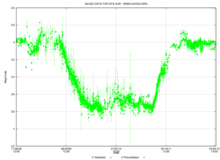The supergiant pulsates, showing small variations in its brightness and spectral lines. The pulsations have been given periods of 67 and 123 days,[31] with an amplitude of about 0.05 magnitudes.[11] The profiles of many spectral lines show variations that would be expected from a pulsating supergiant, but whether they have the same period as the brightness variations is unclear. There may be a small variation in the effective temperature of the photosphere as the star pulsates.[32]