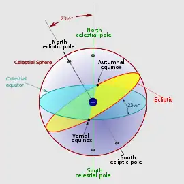 - First point of Aries and first point of Libra: names referring to the astrological signs the Sun is entering. However, the precession of the equinoxes has shifted these points into the constellations Pisces and Virgo, respectively.[25]