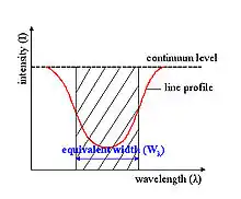 Here, represents the underlying continuum intensity, while represents the intensity of the actual spectrum (the line and continuum). Then represents the width of a hypothetical line which drops to an intensity of zero and has the "same integrated flux deficit from the continuum as the true one."[2] This equation can be applied to either emission or absorption, but when applied to emission, the value of is negative, and so the absolute value is used.
