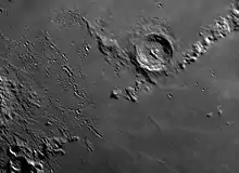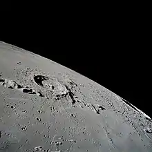 Eratosthenes crater is a relatively deep lunar impact crater that lies on the boundary between the Mare Imbrium and Sinus Aestuum mare regions. It forms the western terminus of the Montes Apenninus mountain range. It is named after ancient Greek astronomer Eratosthenes of Cyrene,[1] who estimated the circumference of the Earth, and the distance from the Earth to the Sun.