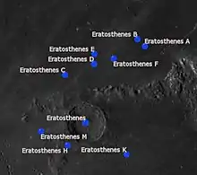 By convention these features are identified on lunar maps by placing the letter on the side of the crater midpoint that is closest to Eratosthenes.