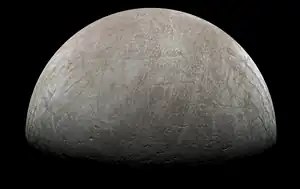 Slightly smaller than Earth's Moon, Europa is made of silicate rock and has a water-ice crust[14] and probably an iron–nickel core. It has a very thin atmosphere, composed primarily of oxygen. Its white-beige surface is striated by light tan cracks and streaks, but craters are relatively few. In addition to Earth-bound telescope observations, Europa has been examined by a succession of space-probe flybys, the first occurring in the early 1970s. In September 2022, the Juno spacecraft flew within about 200 miles of Europa for a more recent close-up view.[15]