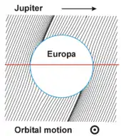 Europa orbits Jupiter in just over three and a half days, with an orbital radius of about 670,900 km. With an orbital eccentricity of only 0.009, the orbit itself is nearly circular, and the orbital inclination relative to Jupiter's equatorial plane is small, at 0.470°.[36] Like its fellow Galilean satellites, Europa is tidally locked to Jupiter, with one hemisphere of Europa constantly facing Jupiter. Because of this, there is a sub-Jovian point on Europa's surface, from which Jupiter would appear to hang directly overhead. Europa's prime meridian is a line passing through this point.[37] Research suggests that the tidal locking may not be full, as a non-synchronous rotation has been proposed: Europa spins faster than it orbits, or at least did so in the past. This suggests an asymmetry in internal mass distribution and that a layer of subsurface liquid separates the icy crust from the rocky interior.[10]