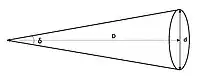in which is the angular diameter, and and are the actual diameter of and the distance to the object. When , we have , and the result obtained is in radians.