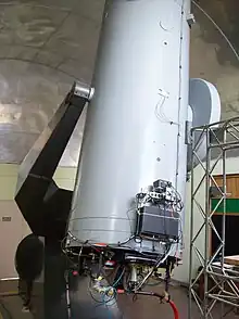 The principal telescope of EACUC is a double astrograph consisting of two lenses each 20-inches (50.8 cm) in diameter, one designed for blue light and the other for yellow light. The lenses focus the light separately onto two photographic plates with dimensions of 17×17 inches (43×43 cm). The photographic plates are purchased in the U.S., shipped to Argentina, exposed in the telescope, developed, and then shipped back to the U.S. In New Haven, Connecticut, the plates are measured with a precision measuring machine.