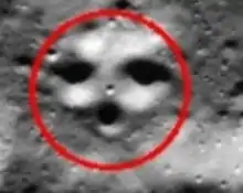 The Face on Moon South Pole is a region on the Moon (81.9° south latitude and 39.27° east longitude) that was detected automatically in an image from the Lunar Reconnaissance Orbiter by a computer system using face recognition technologies,[1] as a result of a project that was part of the International Space App Challenge 2013 Tokyo. It is composed of craters and shadows on the Moon's surface that, together, form an image resembling a face.[2]