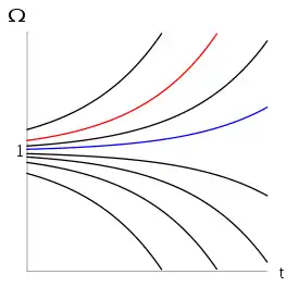 Thus if initially takes any arbitrary value, a period of inflation can force it down towards 0 and leave it extremely small - around as required above, for example. Subsequent evolution of the universe will cause the value to grow, bringing it to the currently observed value of around 0.01. Thus the sensitive dependence on the initial value of Ω has been removed: a large and therefore 'unsurprising' starting value need not become amplified and lead to a very curved universe with no opportunity to form galaxies and other structures.