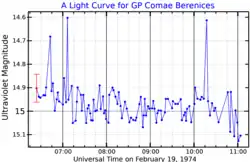 ![]() An ultraviolet band light curve for GP Comae Berenices, adapted from Smak (1975).[1] The error bar shown on the leftmost point applies to all points. | |