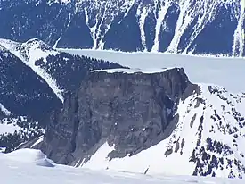 Ganges Mensa is a mesa that sits in a deep upstream basin of the peripheral Ganges Chasma arm of the Valles Marineris valley network. It stretches for nearly 100 kilometres (60 mi) from east to west and 50 kilometres (30 mi) to the north and south between the walls of Ganges Chasma, bounded to the north by a sharp escarpment and gradually tapering towards the valley floor on the south. At its peak, the mesa rises up to 4 kilometres (13,000 ft) from the Ganges Chasma floor,[4] and its profile has an average elevation of 2 kilometres (6,600 ft) from the valley floor.[5] Ganges Mensa and Hebes Mensa are the only mesas of Valles Marineris that extend to the height of the surrounding plateau terrain.[2] The mesa is separated from the canyon walls to the north by a moat-like stretch of valley floor, similar to Hebes and Capri Mensae and many of the mesa structures observed within Valles Marineris.[3] Some researchers have interpreted Ganges Mensa to overlay chaos terrains in upstream Ganges Chasma.[2]