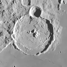 Gassendi is a large lunar impact crater feature located at the northern edge of Mare Humorum. It was named after French astronomer Pierre Gassendi.[1] The formation has been inundated by lava during the formation of the mare, so only the rim and the multiple central peaks remain above the surface. The outer rim is worn and eroded, although it retains a generally circular form. A smaller crater – Gassendi A – intrudes into the northern rim, and joins a rough uplift at the northwest part of the floor. The crater pair bear a curious resemblance to a diamond ring.