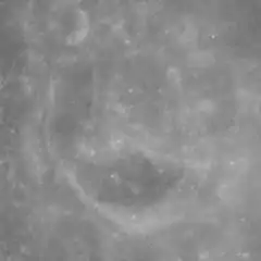 This crater has a low rim and an irregular interior that makes it a relatively inconspicuous formation. The rim is roughly circular but somewhat uneven in outline. On the inner floor are several ridges that divide up the interior into several minor peaks and valleys. A pair of tiny, bowl-shaped craters are attached to the southern edge of the crater rim.