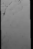 The western part of Pluto's northern hemisphere consists of an extensive, highly distinctive set of 500-meter-high mountains informally named Tartarus Dorsa; the spacing and shape of the mountains looks similar to scales or to tree bark. A January 2017 Nature paper by Dr. John Moores and his colleagues identified these icy ridges as penitentes.[21] Penitentes are icy depressions formed by erosion and surrounded by tall spires. Pluto is the only planetary body other than Earth on which penitentes have been identified. Although penitentes have been hypothesized on Jupiter's satellite Europa, current theories suggest they may require an atmosphere to form. Moores and his colleagues hypothesize that Pluto's penitentes grow only during periods of high atmospheric pressure, at a rate of approximately 1 centimeter per orbital cycle. These penitentes appear to have formed in the last few tens-of-millions of years, an idea supported by the sparsity of craters in the region, making Tartarus Dorsa one of the youngest regions on Pluto.[21]