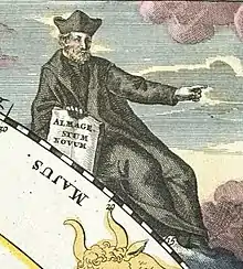 One of Riccioli's most significant works was his 1651 Almagestum Novum (New Almagest),[6] an encyclopedic work consisting of over 1500 folio pages (38 cm x 25 cm) densely packed with text, tables, and illustrations. It became a standard technical reference book for astronomers all over Europe: John Flamsteed (1646–1719), the first English astronomer royal, a Copernican and a Protestant, used it for his Gresham lectures; Jérôme Lalande (1732–1807) of the Paris Observatory cited it extensively[7] even though it was an old book at that point; the 1912 Catholic Encyclopedia calls it the most important literary work of the Jesuits during the seventeenth century.[8] Within its two volumes were ten "books" covering every subject within astronomy and related to astronomy at the time: