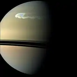The Cassini orbiter was able to track the 2010–11 instance of the storm,[1] also known as the Northern Electrostatic Disturbance, because of an increase in radio and plasma interference, or the Great Springtime Storm.[2]