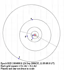 ![]() Orbits of the inner planets of the HD 10180 planetary system, using the orbital configuration from an eight-body (the star and seven planets) Newtonian model taking into account tidal dissipation. | |