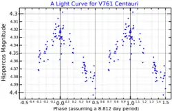 HD 125823, also known as V761 Centauri or a Centauri, is a variable star in the constellation Centaurus. It is a blue-white star that is visible to the naked eye with a mean apparent visual magnitude of +4.41. The distance to this star is approximately 460 light years based on parallax measurements.[2] It is a member of the Upper Centaurus–Lupus subgroup of the Scorpius–Centaurus association.[10]