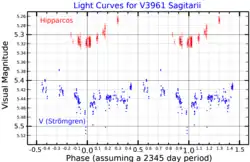 ![]() Visual band light curves for V3961 Sagittarii. The red points show the Hipparcos data,[1] and the blue points show data from Mikulášek et al.[2] | |