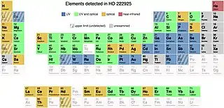 ![]() Elements detected in HD 222925 totalling 65 with 42 coming from the r-process (31 ≤ Z ≤ 92) . Elements with no long-lived isotopes are indicated using the light gray font.[1] | |