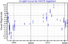 Gaia astrometry suggests a distance much larger than the accepted 1.9kpc,[19][1] and would imply a much higher luminosity. It may even lie close to the Galactic Center.[20]