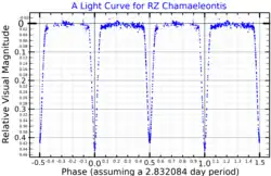 ![]() A visual band light curve for RZ Chamaeleontis, plotted from data published by Jørgensen & Gyldenkerne (1975)[1] | |