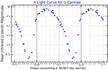 U Car is a δ Cepheid variable with a period of 38.7681 days. It was one of the earliest Cepheids to be discovered. It has also one of the longest periods, and hence is one of the most luminous in the class.[9] There are still only a few Cepheids with longer periods, including RS Puppis, SV Vulpeculae, and the unusual S Vulpeculae.[2]