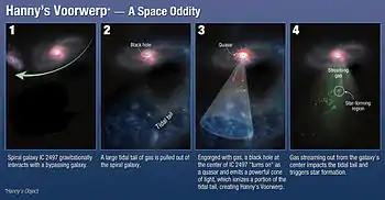 Hanny's Voorwerp /ˈhʌniz ˈvɔːrwɛərp/, (Dutch for Hanny's object) is a rare type of astronomical object called a quasar ionization echo.[1][2][3][4] It was discovered in 2007 by Dutch schoolteacher Hanny van Arkel while she was participating as a volunteer in the Galaxy Zoo project, part of the Zooniverse group of citizen science websites. Photographically, it appears as a bright blob close to spiral galaxy IC 2497 in the constellation Leo Minor.