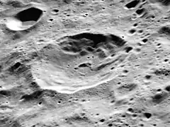 Henderson is a crater on the far side of the Moon. It is located to the east of the huge walled plain Mendeleev. This is a worn crater with a shallow rim. No significant craters overlie the rim or interior, but a smaller, worn crater is attached to the southern outer rim. A ridge of material runs from the northwest rim to the midpoint of the floor. Henderson lies within the eroded remains of a larger and older crater-like feature.