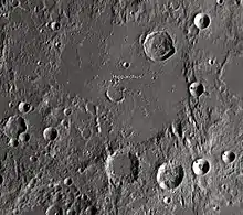 Hipparchus is the degraded remnant of a lunar impact crater. It was named after the Greek astronomer, geographer and mathematician Hipparchus.[1] It is located to the southeast of Sinus Medii, near the center of the visible Moon. To the south is the prominent crater Albategnius, and to the southwest lies Ptolemaeus, a feature of comparable dimensions to Hipparchus. Horrocks lies entirely within the northeast rim of the crater. Halley is attached to the south rim, and Hind lies to the southeast. To the north-northeast is the bowl-shaped Pickering, and the flooded Saunder is located off the northeast rim. High-resolution images of Hipparchus were obtained by Lunar Orbiter 5 in 1967.