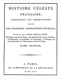 Histoire céleste française (French Celestial History) is an astrometric star catalogue published in 1801 by the French astronomer Jérôme Lalande and his staff at the Paris Observatory. This star catalog consists of the locations and apparent magnitudes of 47,390 stars, up to magnitude 9.[1] Stars are identified by common name, Bayer designation or Flamsteed designation, when available. It also contains observations of other astronomical phenomena. It was the largest and most complete star catalog of its day. This publication is a collection of several books of astronomical recordings taken over the previous decade at the observatory.