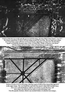 The principle was included in a memorandum[6] authored by Walter Hausz of General Electric that was part of the then-secret report of a 1952 Dept. of Defense summer study conference called TEOTA ("The Eyes of the Army"),[7] which sought to identify new techniques useful for military reconnaissance and technical gathering of intelligence. A follow-on summer program in 1953 at the University of Michigan, called Project Wolverine, identified several of the TEOTA subjects, including Doppler-assisted sub-beamwidth resolution, as research efforts to be sponsored by the Department of Defense (DoD) at various academic and industrial research laboratories. In that same year, the Illinois group produced a "strip-map" image exhibiting a considerable amount of sub-beamwidth resolution.
