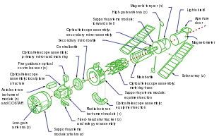 When launched, the HST carried five scientific instruments: the Wide Field and Planetary Camera (WF/PC), Goddard High Resolution Spectrograph (GHRS), High Speed Photometer (HSP), Faint Object Camera (FOC) and the Faint Object Spectrograph (FOS). WF/PC used a radial instrument bay, and the other 4 instruments were each installed in an axial instrument bay.[55]