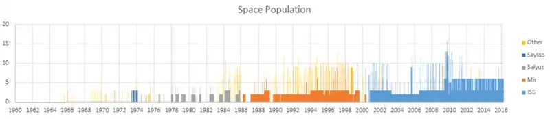Space stations have harboured so far the only long-duration direct human presence in space. After the first station Salyut 1 (1971) and its tragic Soyuz 11 crew, space stations have been operated consecutively since Skylab (1973), having allowed a progression of long-duration direct human presence in space. Long-duration direct human presence has been joined by visiting crews since 1977 (Salyut 6). Consecutive direct human presence in space has been achieved since the Salyut successor Mir by 1987. Uninterrupted direct human presence in space has been achieved since the operational transition from the Mir to the ISS, with its first occupation in 2000.[3] At times the number of people present in space at the same time has climbed since 1995 above 13[39] with a record 17 in 2023 on two space stations.[40] The ISS has hosted the most people in space at the same time, reaching 13 for the first time during the eleven day docking of STS-127 in 2009.[41]