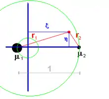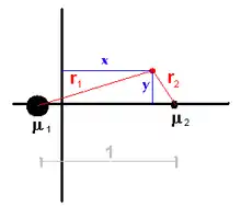 One of the suitable coordinate systems used is the so-called synodic or co-rotating system, placed at the barycentre, with the line connecting the two masses μ1, μ2 chosen as x-axis and the length unit equal to their distance. As the system co-rotates with the two masses, they remain stationary and positioned at (−μ2, 0) and (+μ1, 0).[lower-alpha 1]