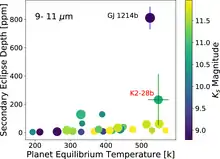 K2-28b is a sub-Neptune sized planet orbiting its star in only 2.26 days. Despite its short orbital period the equilibrium temperature of the planet is a relatively low 500 Kelvin due to the low luminosity of the parent star.[4] Because of the very small size of the parent star this planet is a particularly favorable target for transmission spectroscopy by the James Webb Space Telescope which should be able to determine if the atmosphere is cloudy or clear by observing roughly 5 transits.[9] Among a group of small and cool planets orbiting relatively bright M-dwarfs its predicted secondary eclipse depth of 230 parts-per-million is second only to Gliese 1214 b.[3]