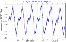 k Puppis is listed in the General Catalogue of Variable Stars as a suspected variable star, but the range and type are not stated. The International Bulletin of Variable Stars has since published research showing that k2 Puppis is the variable component. It is an SX Arietis variable with a period of 1.9093 days which is also the rotational period of the star. The total amplitude is 0.015 apparent magnitude.[4]
